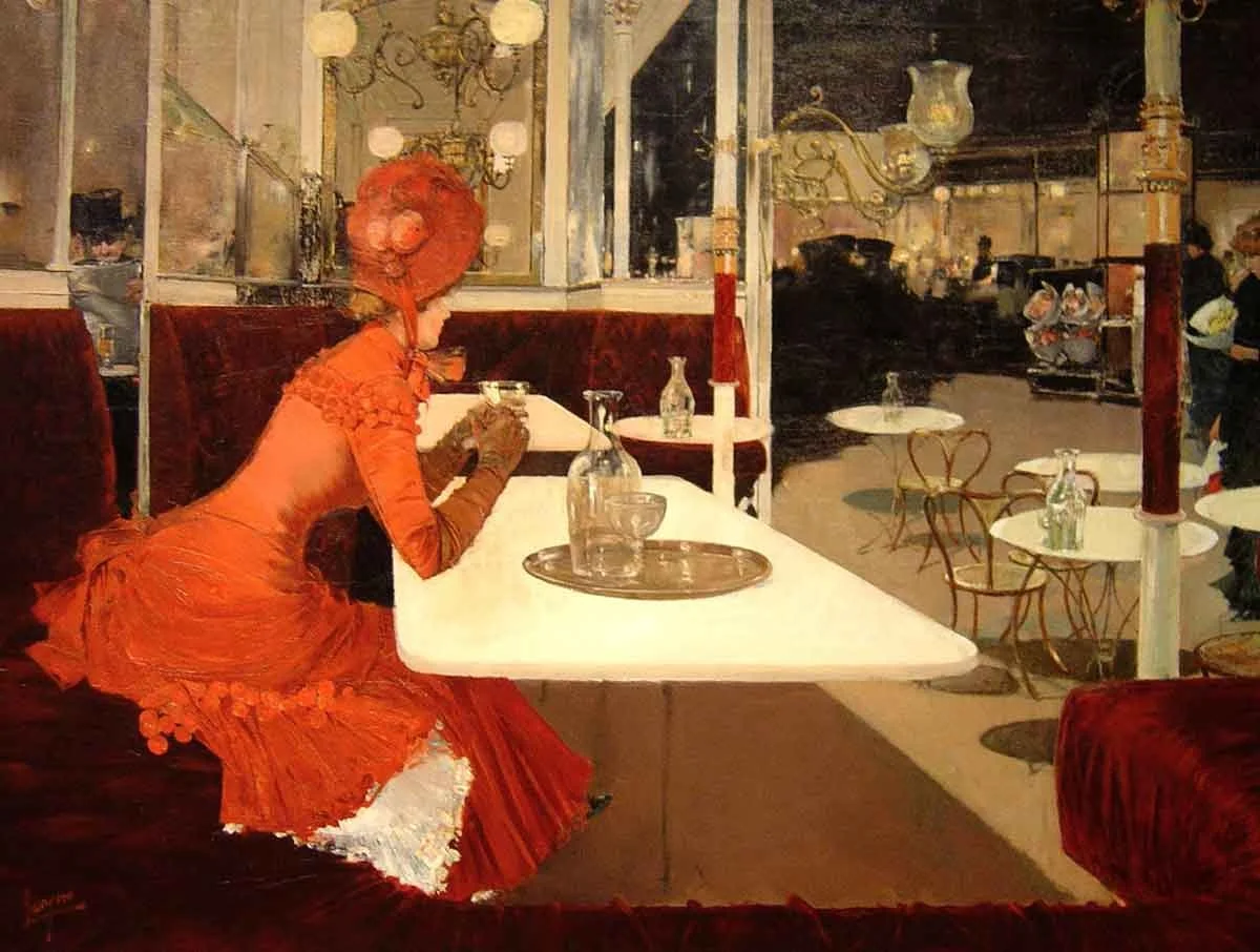 A painting by Fernard Lungren - The café 1882. Image shows a ladie enjoying the delights of a parisien cafe