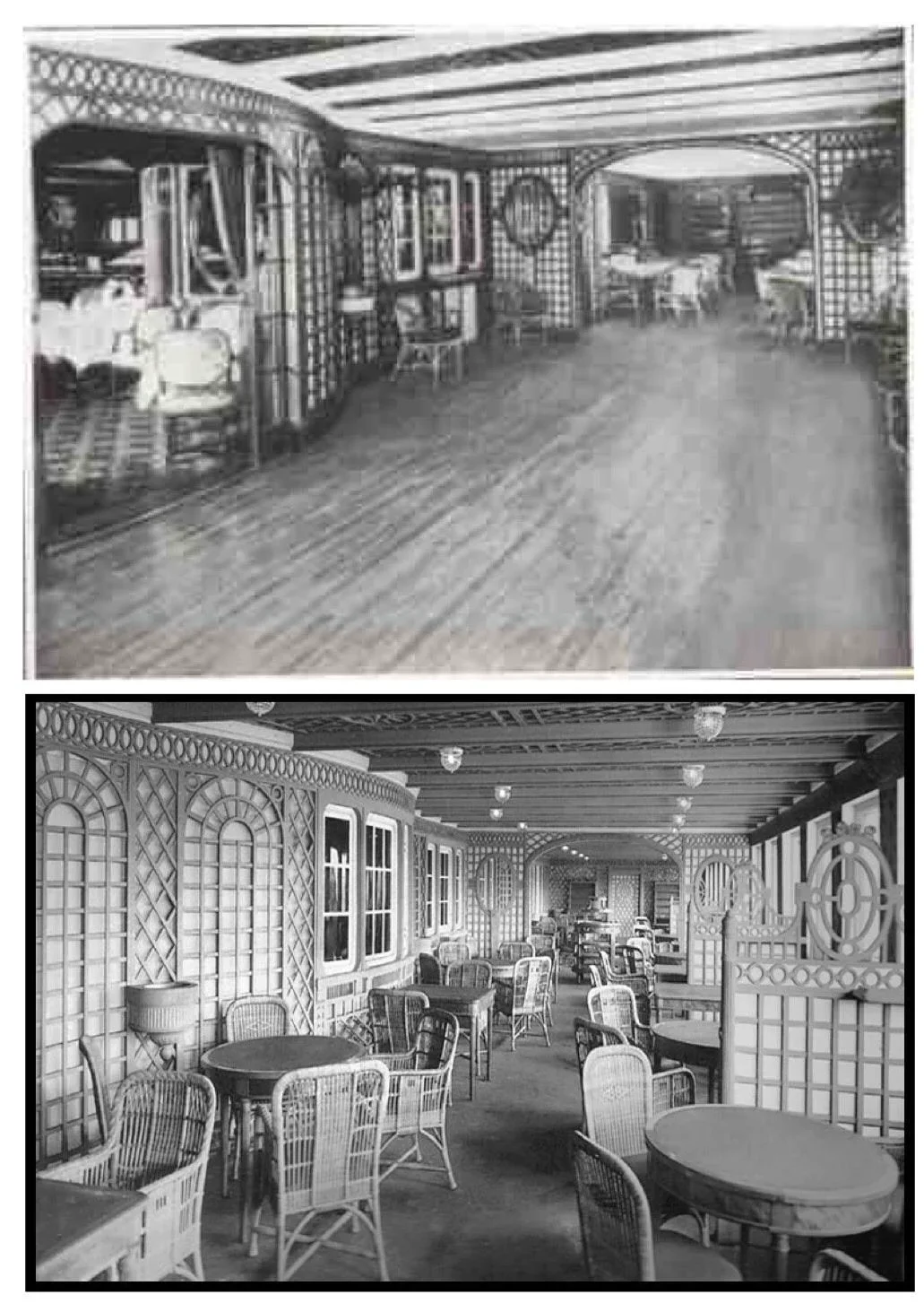 The Titanic designers used Paris trellis to hide the bare steel walls using arches and circular motifs. They encouraged plants to grow up the trellis to further hide the steelwork.